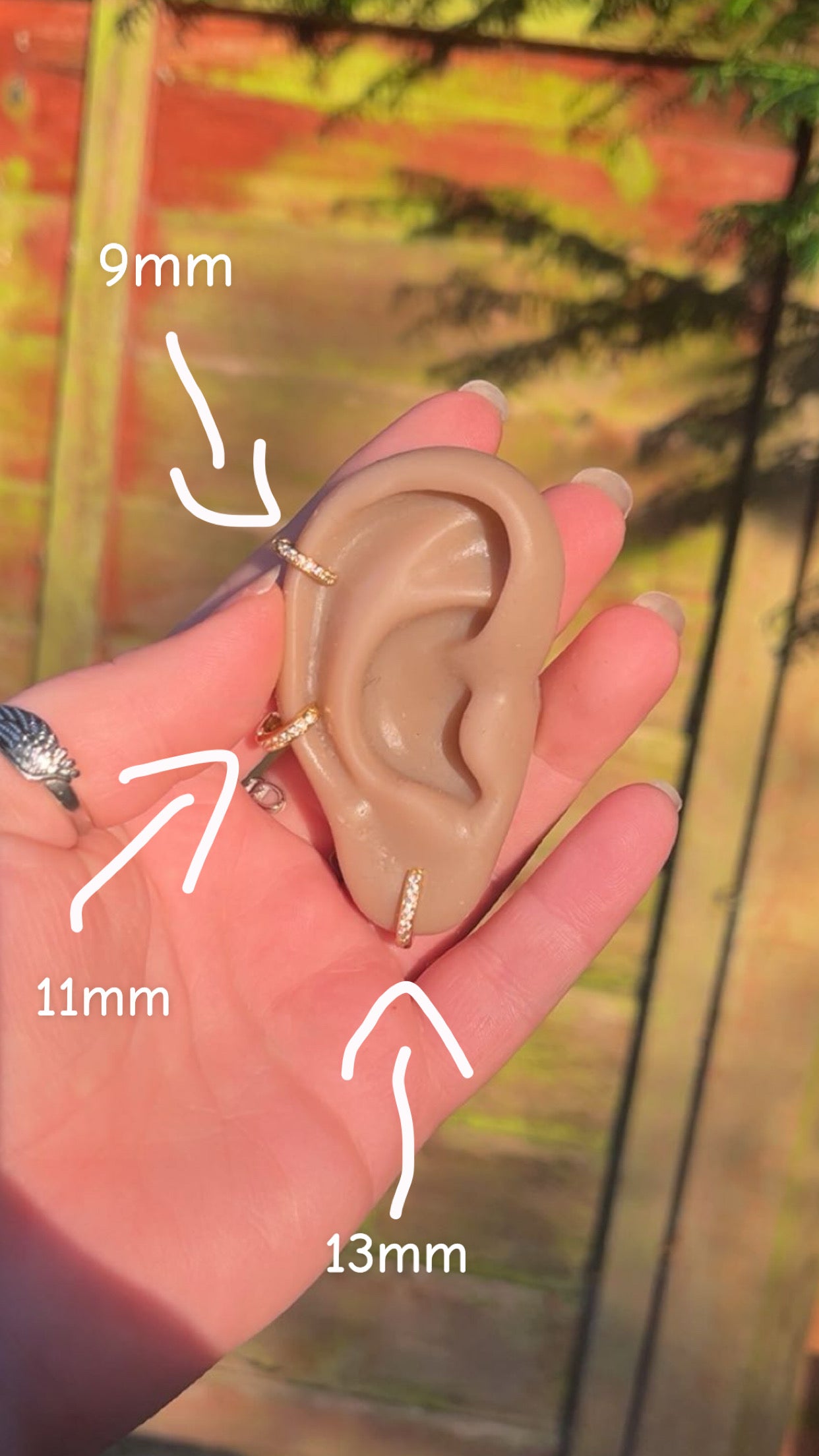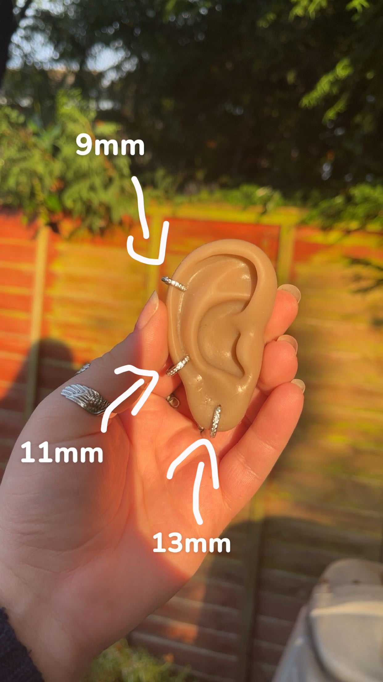 9mm and 11mm are perfect for helix and cartilage piercings, and 13mm are perfect for lobes.